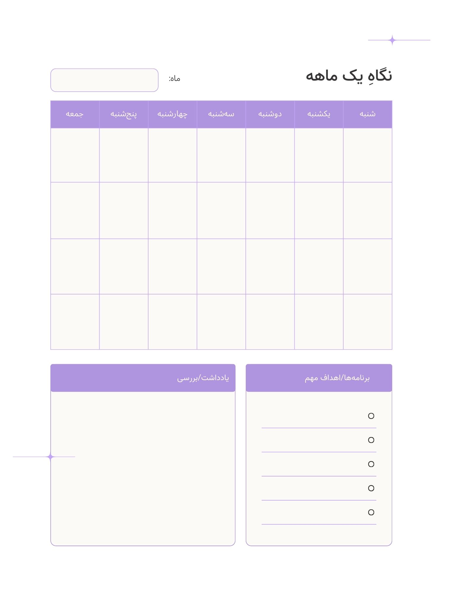 گاهی نیاز است که به صفحۀ نگاه ماهانه برگردید و ببینید که به کدام کارها رسیدهاید یا چه چیزی از قلم افتاده است. این صفحه حکم راهنمای مسیر شما را دارد.