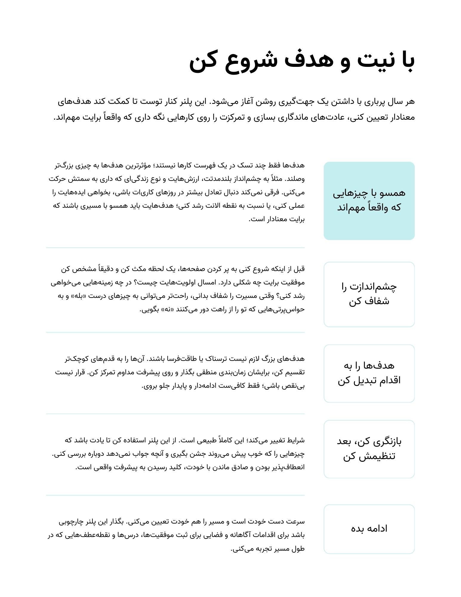 تاریخها و اعداد در این دفتر توسط خودتان وارد میشود و نیازی نیست که حتماً از اولین روز سال شروع به برنامهریزی کنید.