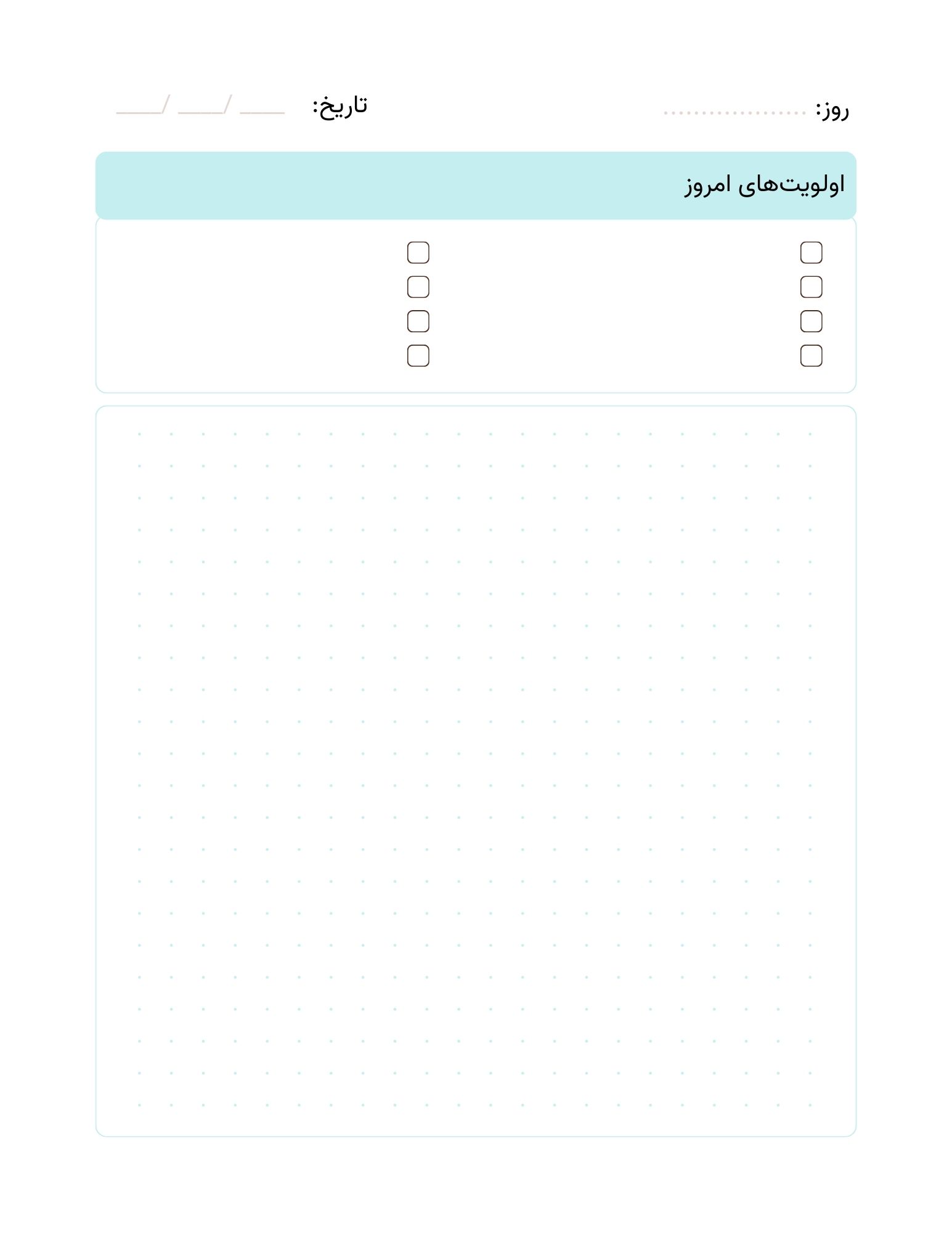 در صفحات برنامهریزی روزانه، از بولت ژونال (نقاط) و جدول اولویتهای مهم روز استفاده شده است تا شما بتوانید برنامه را به دلخواه و سلیقه خودتان شخصیسازی کنید. مثلاً میتوانید خودتان جدول بکشید، یا از تایم باکسینگ استفاده کنید. هر روشی که برای شما بهتر جواب میدهد!